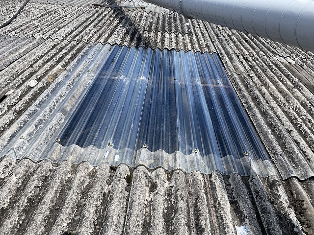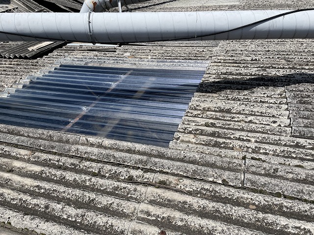今回は割れているスレート材の上からFRP(バンポーライト)で雨漏りを防ぐ工事をさせて頂きました。他にも明り取り部に雨漏りヶ所がありましたので古い明り取り交換後FRPで明り取りを差し替え工事を提案させて頂きました。